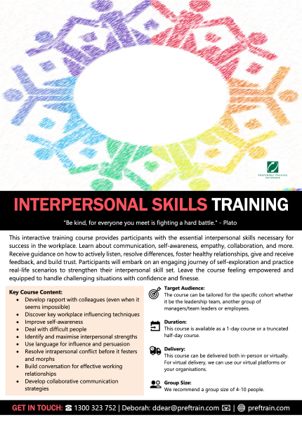 Interpersonal skills in-house training courses help participants understand their behavioural and working together styles. Workplace interpersonal skills levels are nosediving and there’s a growing risk of having “workplace statues”. These statues will turn up for work but will communicate less than 400 words in the whole workday!
